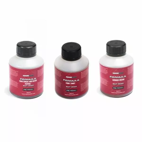 De Formula Bait soaks zijn perfect voor kanalen en grote wateren. De geur en smaak blijft geconcentreerd rondom je haakaas. Zo worden de karpers naar de voerplaats geleid. Laat uw boilies soaken in deze flavour. 50/50 water en flavour is voldoende.Â